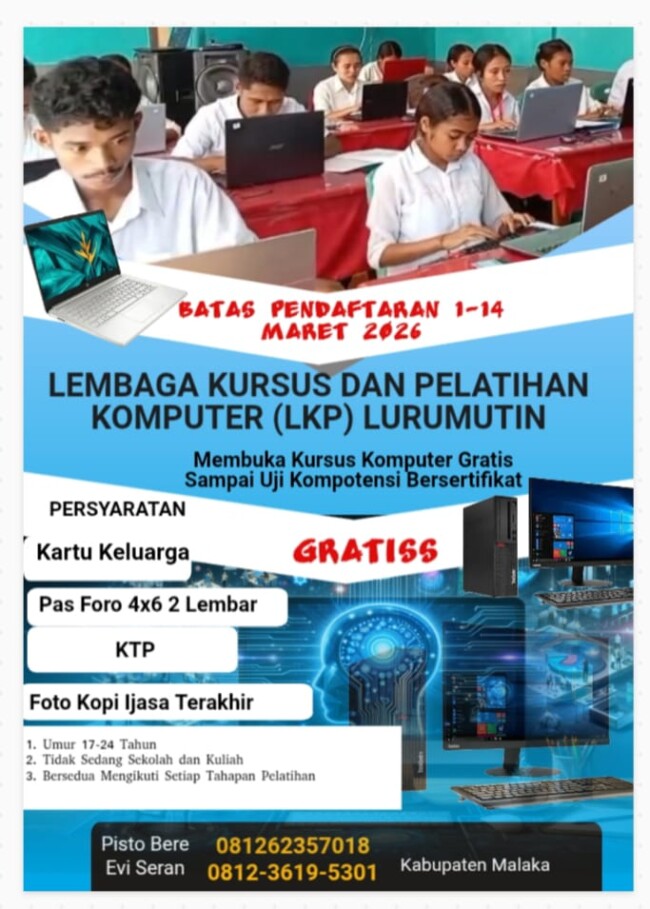 Sejalan dengan itu, terhitung 1 hingga 14 Maret, Lembaga Kursus dan Pelatihan (LKP) Lurumutin di Malaka membuka pendaftaran kursus komputer gratis hingga tahap uji kompetensi bersertifikat. Program ini diperuntukkan bagi pemuda usia 17–24 tahun yang tidak sedang bersekolah maupun kuliah.